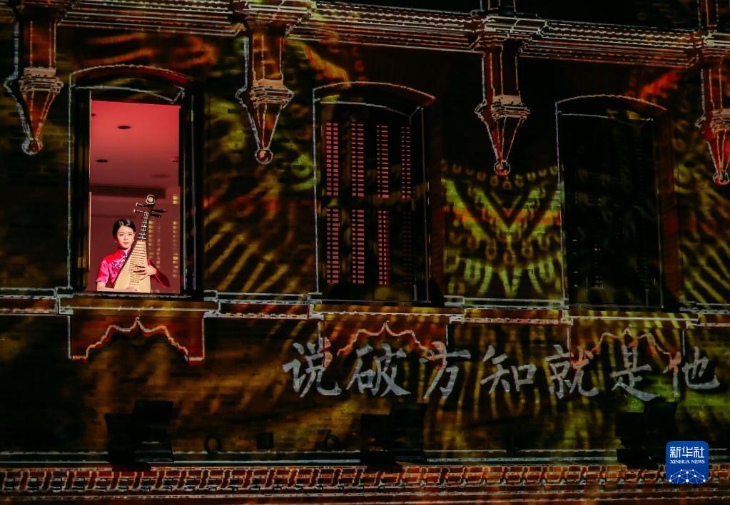 優(yōu)秀歷史建筑“三聯(lián)排”在聲光影效果中,成為如夢(mèng)似幻的戲曲舞臺(4月14日攝)。