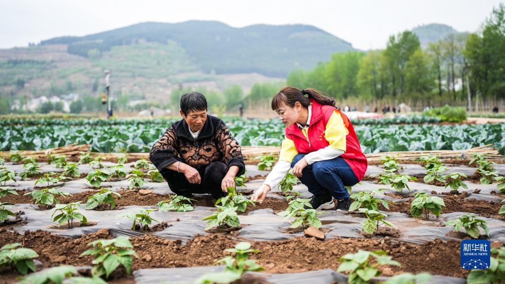 4月14日,農技工作者在六盤(pán)水市鐘山區大河鎮大橋村和村民交流蔬菜種植技術(shù)。