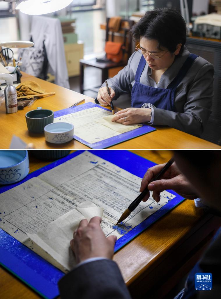 拼版照片:4月14日,在廣西壯族自治區圖書(shū)館古籍保護中心的工作室內,黃玉杏在修補古籍(上圖由新華社記者胡星宇攝;下圖由新華社記者曹祎銘攝)。
