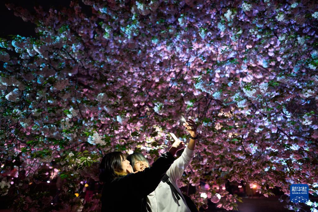 4月10日,游客在日本東京新宿御苑舉行的櫻之燈光秀活動(dòng)中自拍。