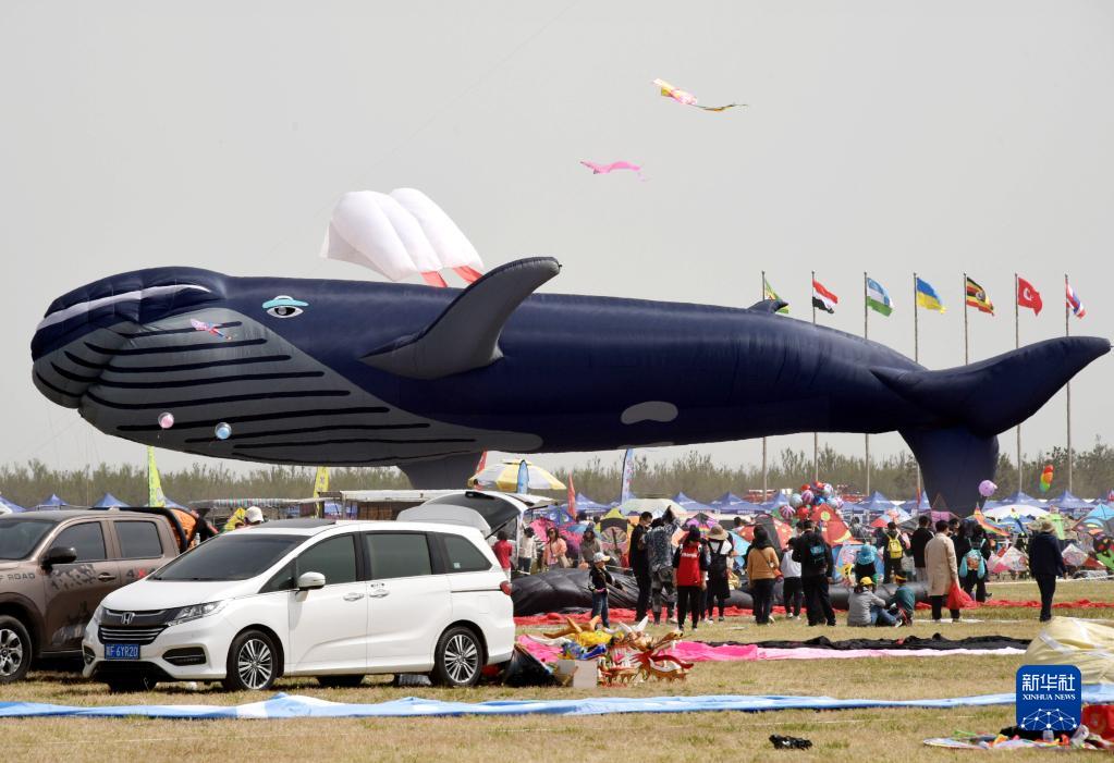 4月15日在濰坊國際風(fēng)箏會(huì )上拍攝的大型鯨魚(yú)造型風(fēng)箏。