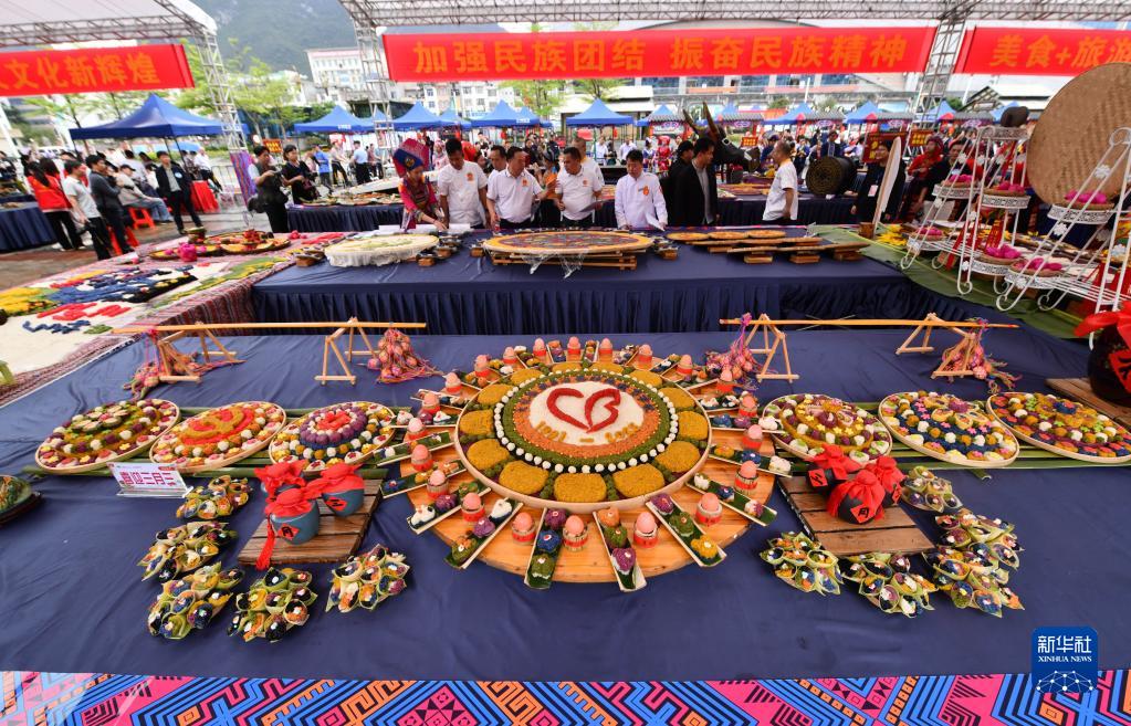當日,廣西河池市大化瑤族自治縣舉辦“美味三月三”美食大賽,當地各族群眾以糯米、七百弄雞、山羊、河魚(yú)等當地特色食材制作的數百道美食參加評比。