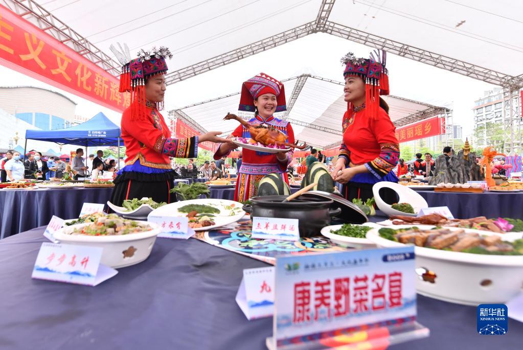 當日,廣西河池市大化瑤族自治縣舉辦“美味三月三”美食大賽,當地各族群眾以糯米、七百弄雞、山羊、河魚(yú)等當地特色食材制作的數百道美食參加評比。