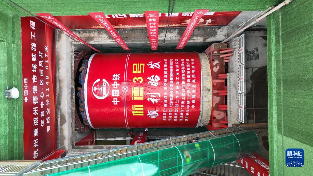 4月15日,浙江省湖州市德清縣杭德市域鐵路隧道工程施工現場(chǎng),盾構機在掘進(jìn)作業(yè)(無(wú)人機照片)。