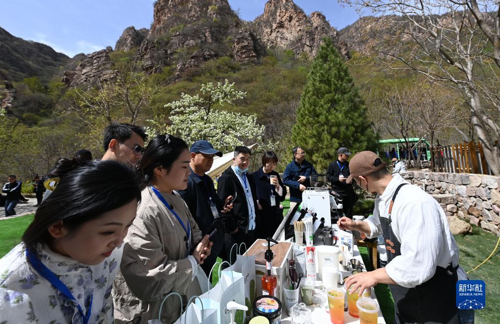 4月15日,游客在天津市薊州區梨木臺景區的特色市集上購買(mǎi)咖啡。