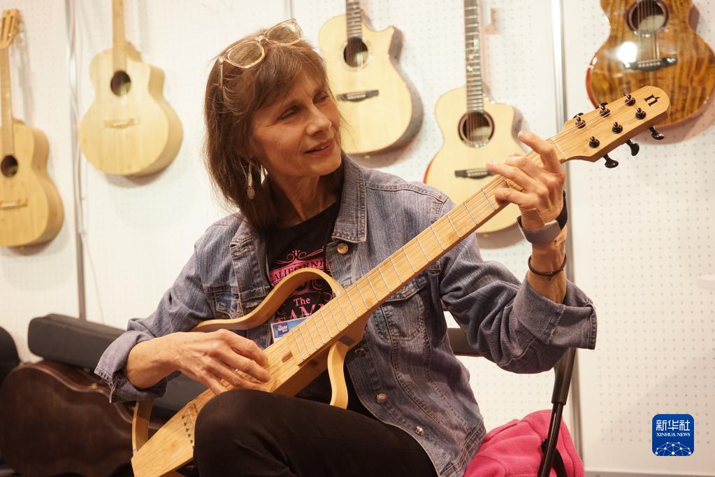 4月13日,在美國加利福尼亞州阿納海姆會(huì )展中心,參觀(guān)者在中國貴州正安吉他產(chǎn)業(yè)園一家公司展位試彈樂(lè )器。