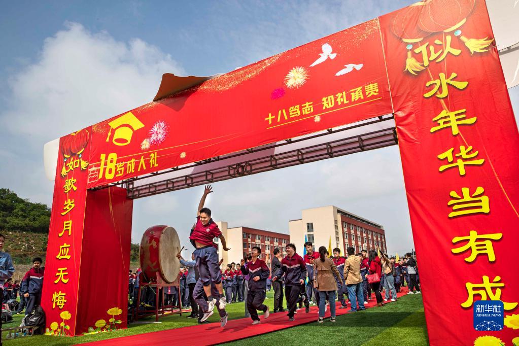 4月15日,黔西第一中學(xué)學(xué)生在成人典禮上穿過(guò)“成人門(mén)”。
