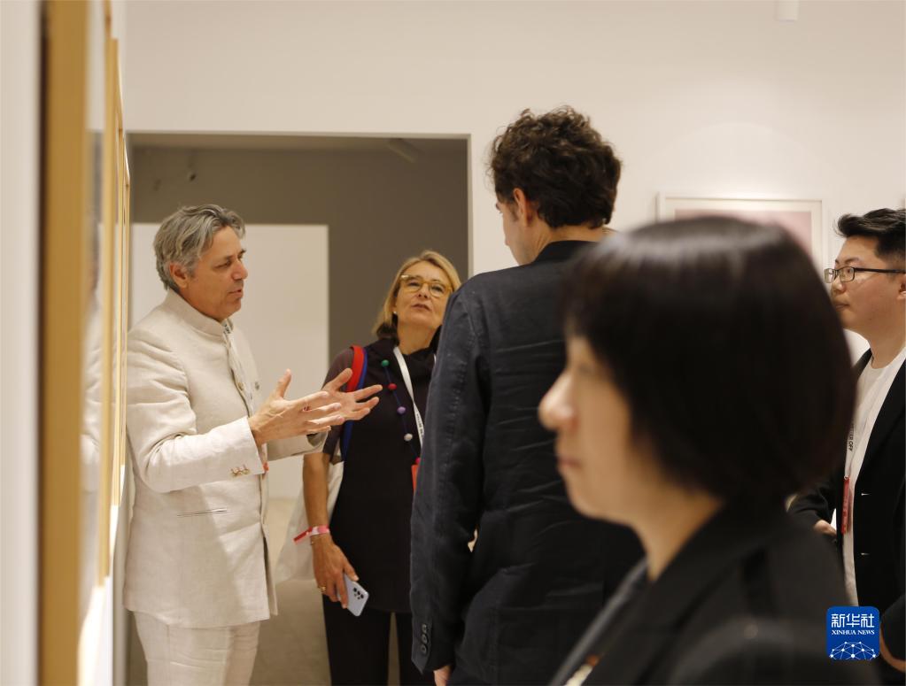 4月15日,受邀嘉賓在“2023第六屆蘇州·金雞湖雙年展”上參觀(guān)、討論藝術(shù)作品。