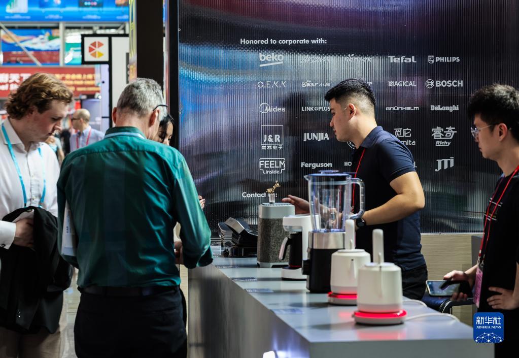 4月15日,采購商在第133屆廣交會(huì )上了解一家中國工業(yè)設計企業(yè)的廚房電器展品。