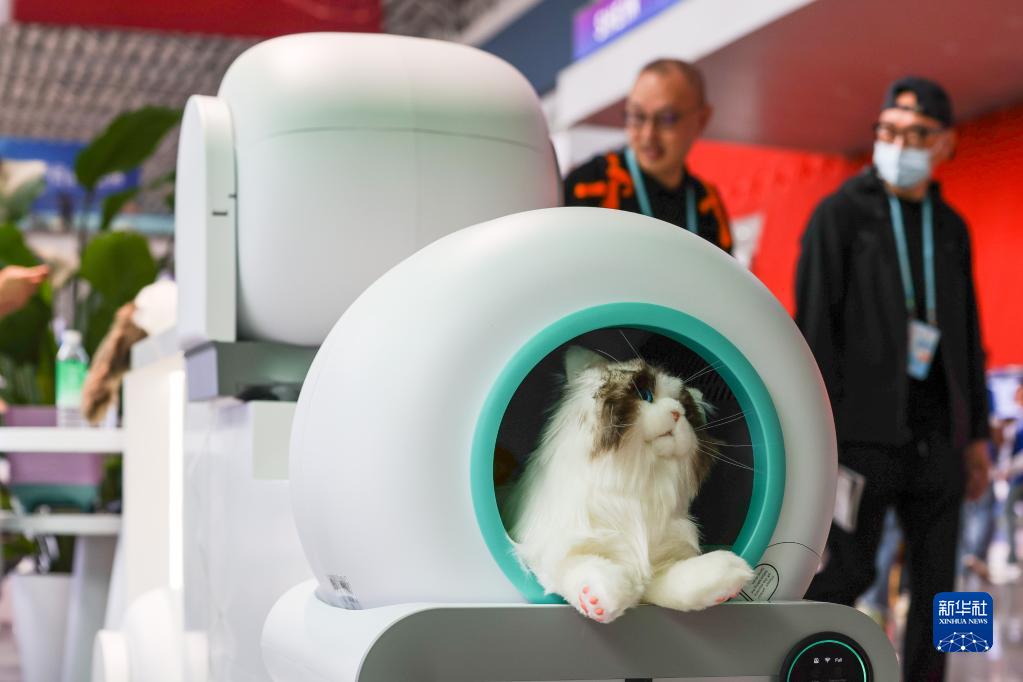 一家中國工業(yè)設計企業(yè)在第133屆廣交會(huì )上展示的全自動(dòng)貓砂盆等寵物電器(4月15日攝)。