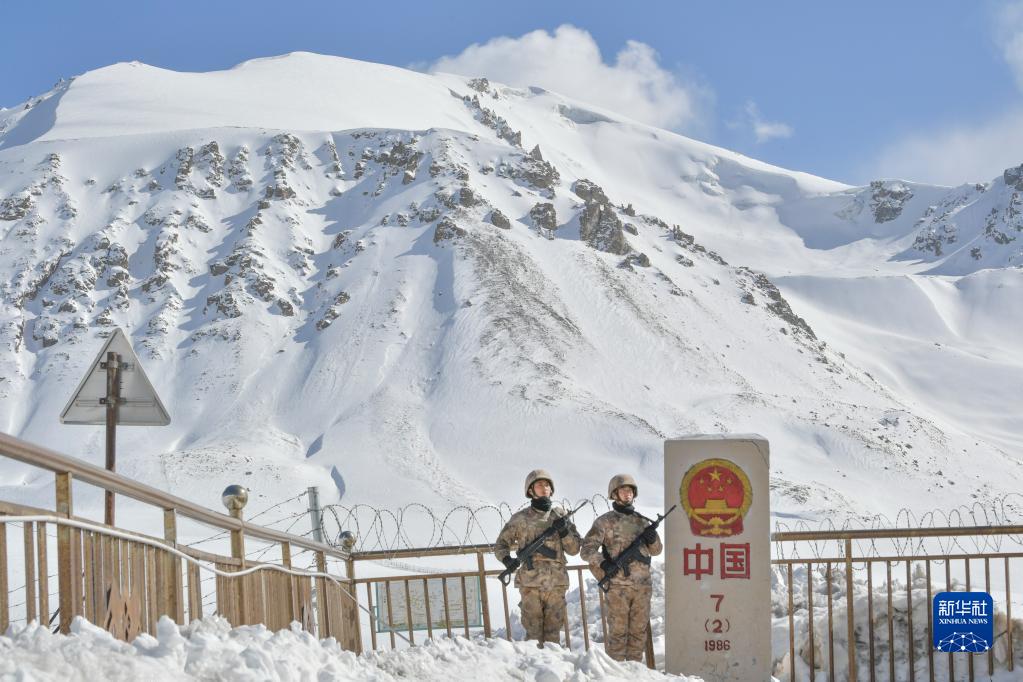 4月13日,周林平(右)和高光輝在中國和巴基斯坦邊境7號界碑處執勤。