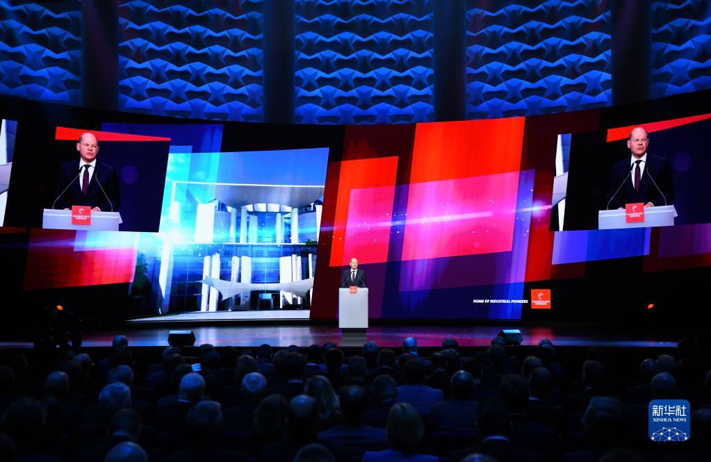 4月16日,德國總理朔爾茨在漢諾威工業(yè)博覽會(huì )開(kāi)幕式上致辭。