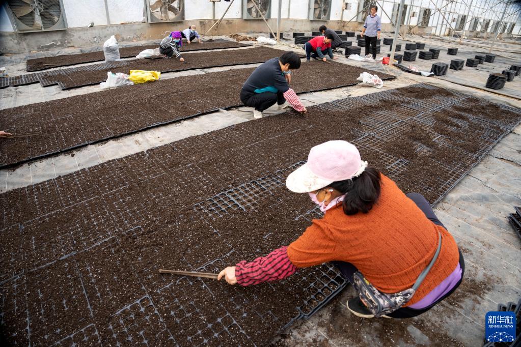4月17日,在河北省永清縣龍虎莊鄉興晟現代農業(yè)園區的育苗大棚內,農戶(hù)在育西瓜苗。
