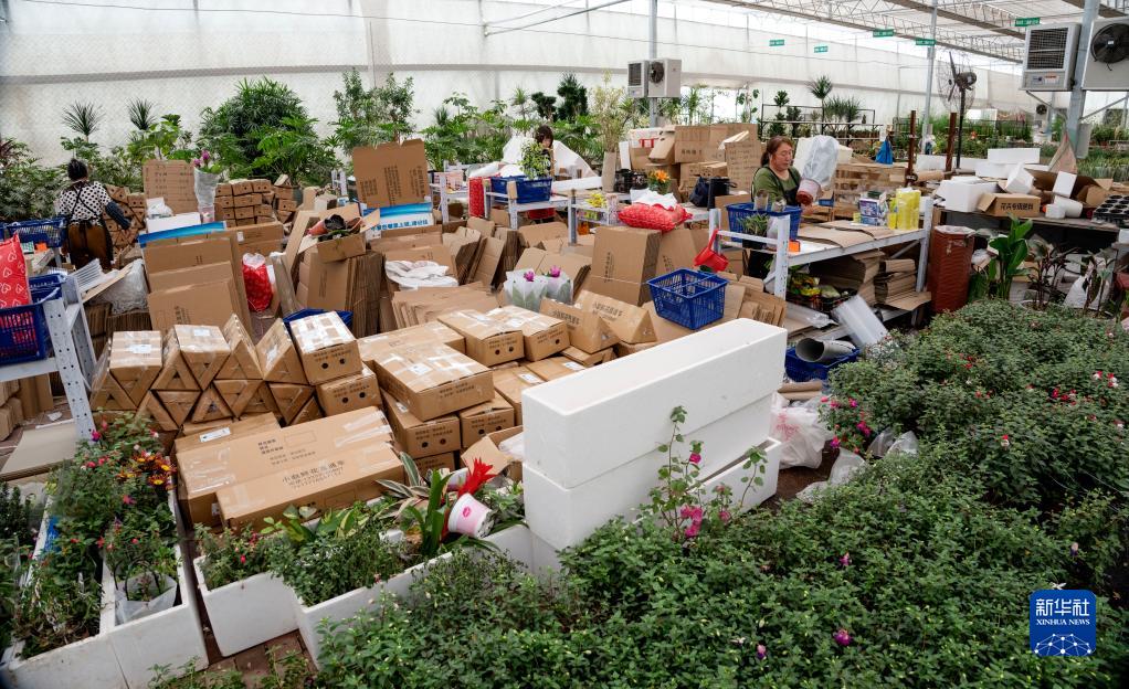 4月17日,在河北省廊坊市永清縣恒美國際花都,工作人員打包鮮花準備發(fā)貨。