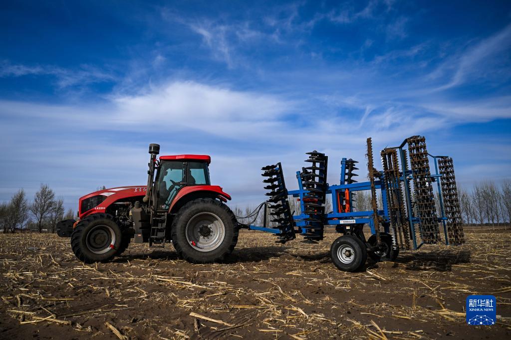 4月12日,在通遼市科爾沁左翼中旗腰林毛都鎮,農機在田間整地。