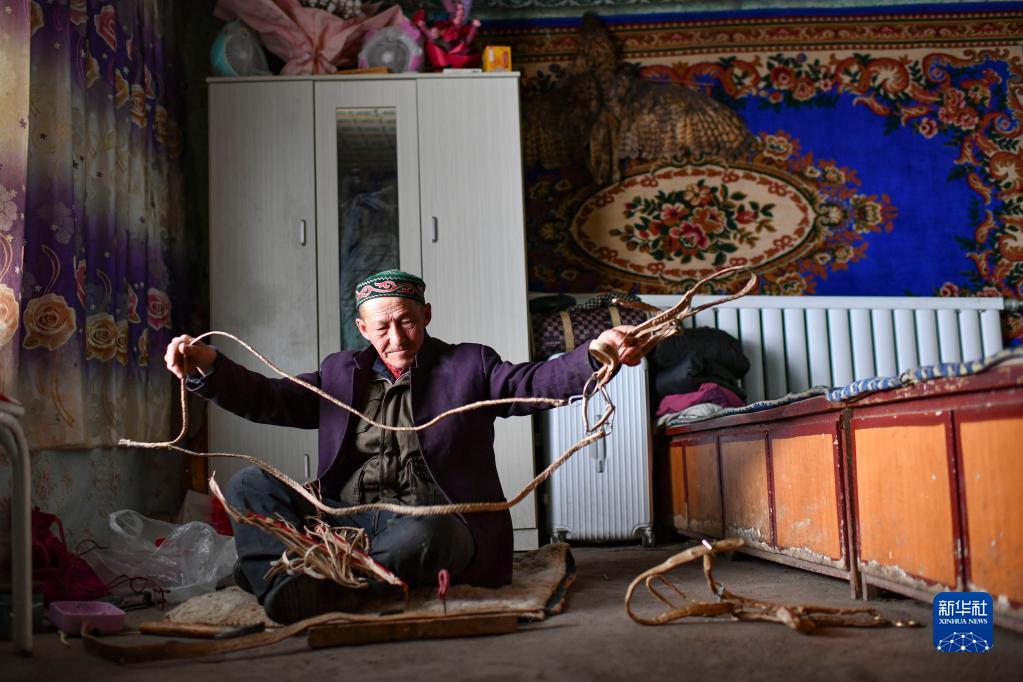 放牧歸來(lái),哈布得拉什么在家中用收購來(lái)的牛皮制作韁繩等放牧用具(2月11日攝)。這些用具將出售給其他有需要的牧民。