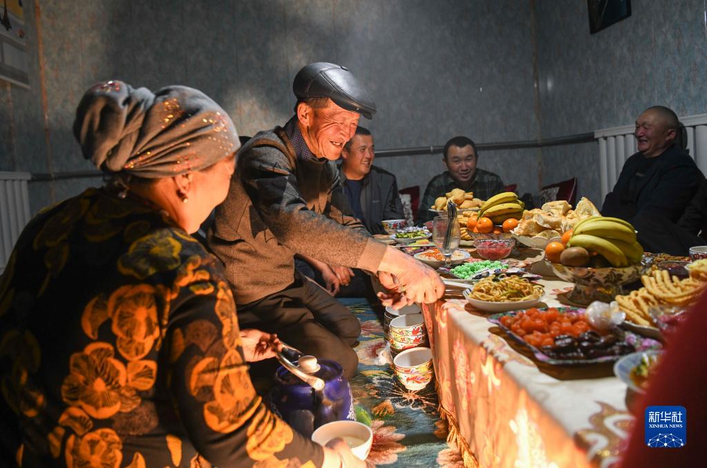 夜間,幾位即將轉場(chǎng)去春牧場(chǎng)的鄰居在家中相聚,巴哈提和丈夫一起招待大家(4月13日攝)。大伙兒要等到冬季再次回到冬牧場(chǎng)時(shí),才能再次齊聚。
