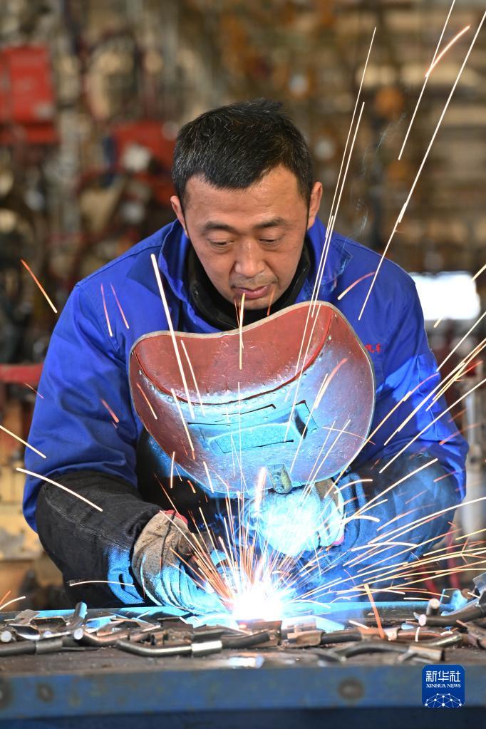 在位于貴州省遵義市匯川區的貴州航天成功汽車(chē)制造有限公司生產(chǎn)車(chē)間,工人在焊接汽車(chē)配件(2月27日攝)。