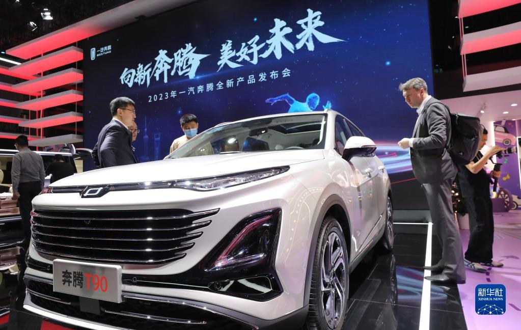 4月18日,參觀(guān)者在一汽奔騰品牌展臺上駐足。