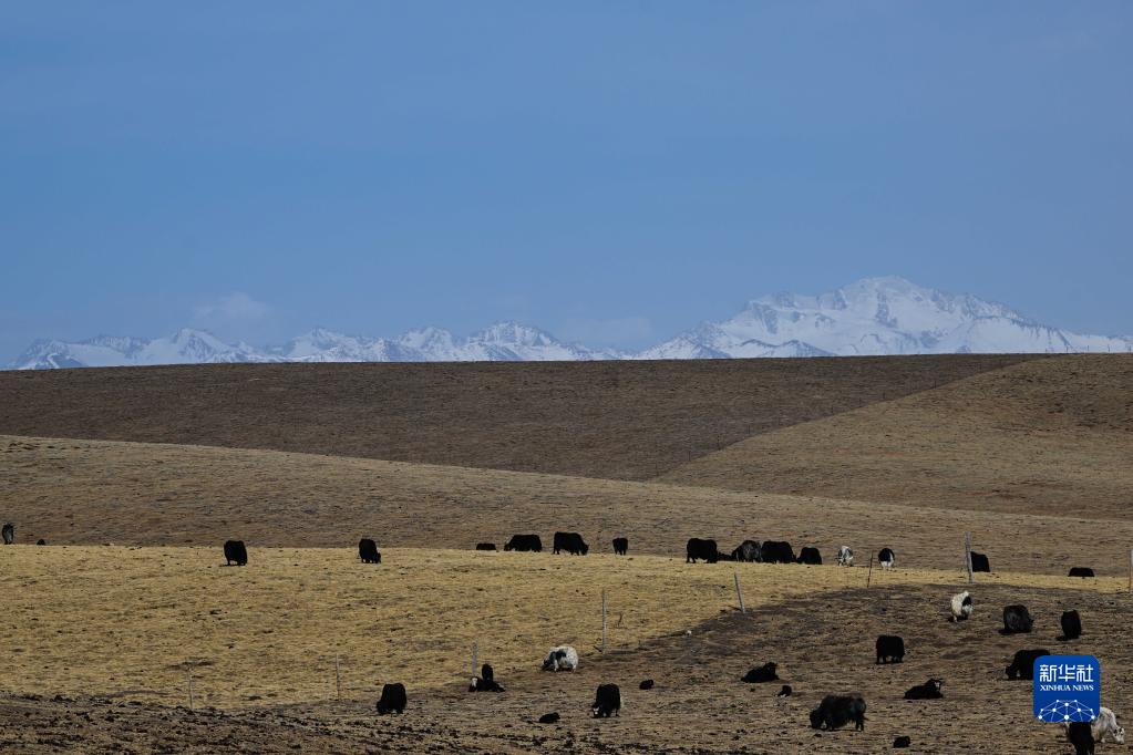 4月17日,在青海省海北藏族自治州門(mén)源回族自治縣皇城蒙古族鄉,一群牦牛在祁連山腹地的草場(chǎng)上活動(dòng)。