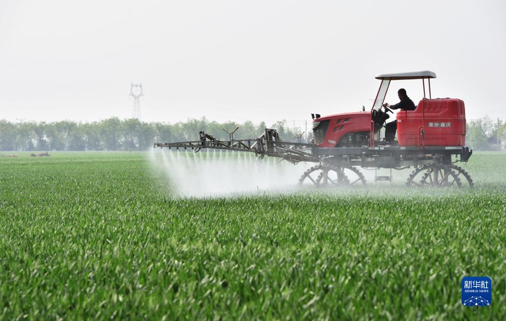 4月19日,河北省邢臺市南和區河郭鎮張相村農民使用農業(yè)機械在麥田噴灑農藥。