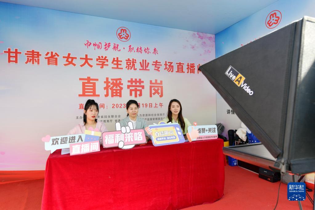 4月19日,主播在甘肅省女大學(xué)生就業(yè)專(zhuān)場(chǎng)招聘活動(dòng)現場(chǎng)進(jìn)行“直播帶崗”。