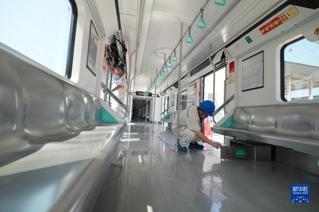 4月19日,在重慶市軌道交通18號線(xiàn)金鰲寺車(chē)輛段,工作人員在對裝配下線(xiàn)的電客車(chē)進(jìn)行檢查。