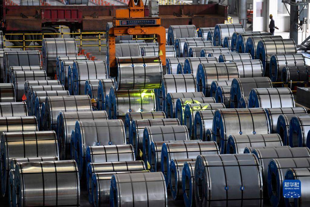 4月19日,在河北雙灤一家釩鈦新材料企業(yè)冷軋產(chǎn)品車(chē)間,工人在吊裝冷軋鍍鋅板。