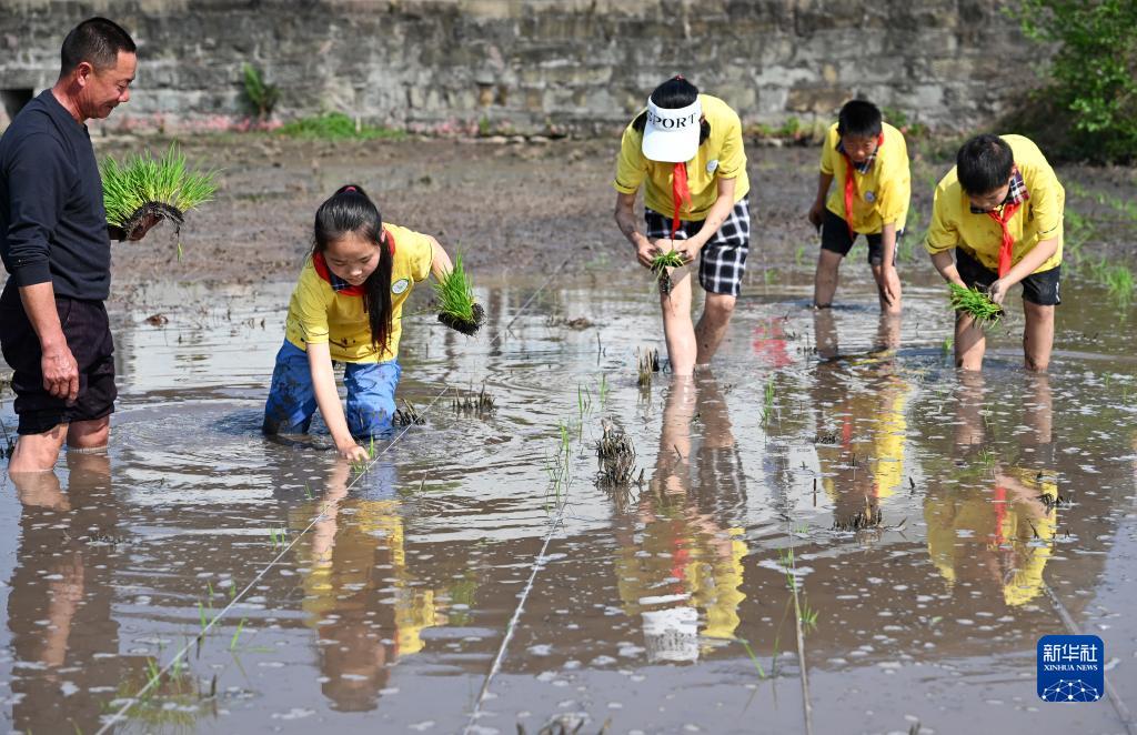 4月19日,在內江市東興區雙才鎮玉皇觀(guān)村,五星小學(xué)的學(xué)生在農民指導下學(xué)習插秧。