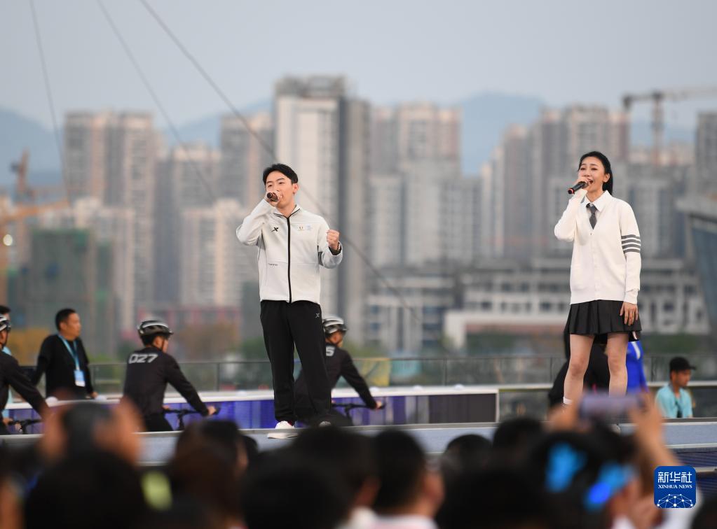4月19日,在成都大運會(huì )倒計時(shí)100天啟動(dòng)儀式上,體操世界冠軍鄒凱(左)演唱歌曲《歡迎來(lái)成都》。