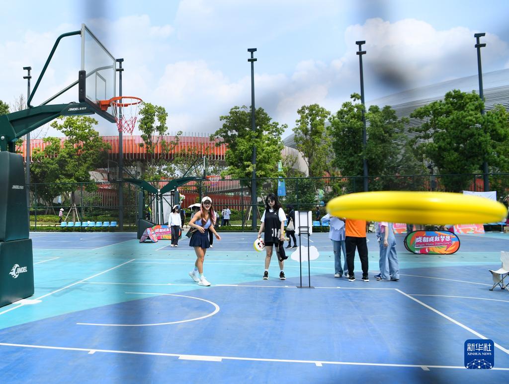 4月19日,在成都東安湖體育公園,體育愛(ài)好者在 “潮流運動(dòng)會(huì )”上體驗飛盤(pán)。