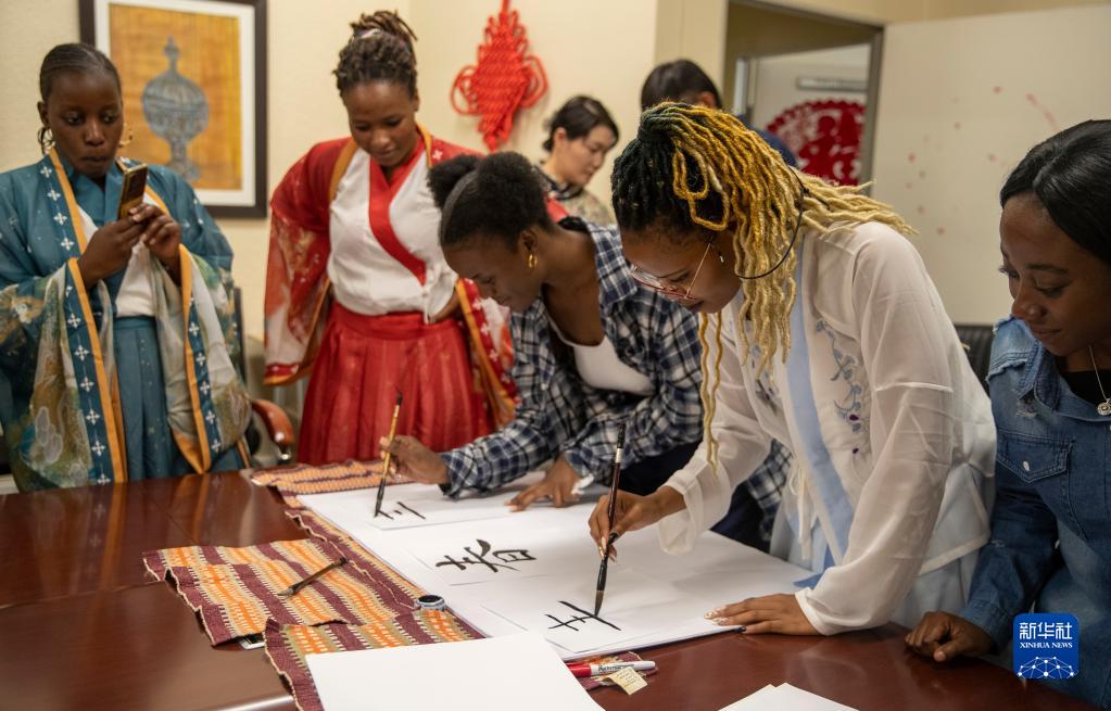 4月19日,學(xué)生在南非約翰內斯堡大學(xué)孔子學(xué)院體驗寫(xiě)毛筆字。