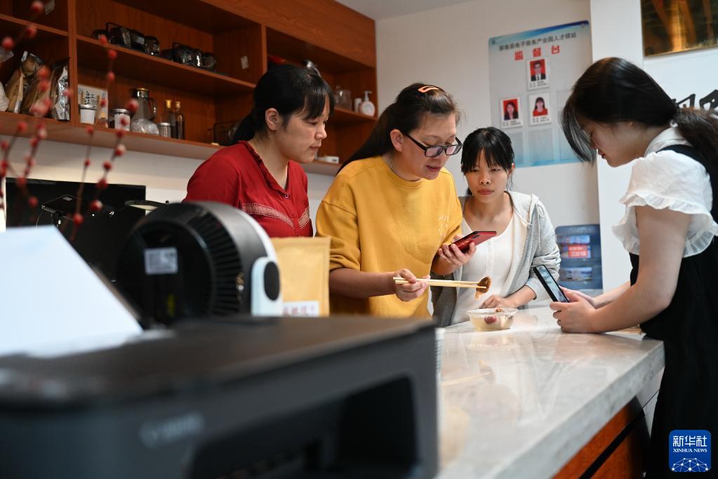 4月19日,屏南縣電商創(chuàng )業(yè)者楊晨芬(左二)在直播前與員工交流拍攝技巧。