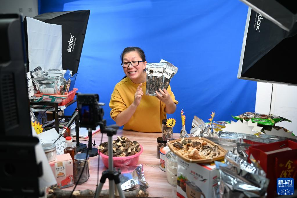 4月19日,屏南縣電商創(chuàng )業(yè)者楊晨芬在直播銷(xiāo)售土特產(chǎn)。