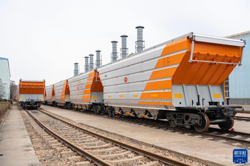 這是4月19日在中車(chē)齊車(chē)公司廠(chǎng)區拍攝的由該公司生產(chǎn)的煤炭漏斗車(chē)。