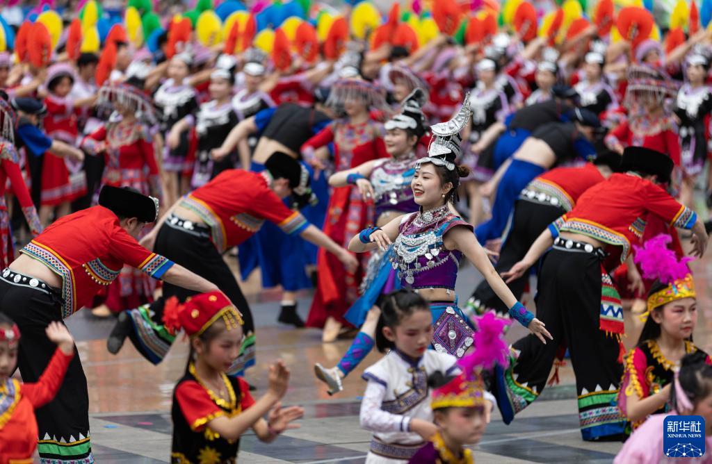 當日,四川省級非遺“興文苗族花山節”展示傳承活動(dòng)在四川省興文縣市民廣場(chǎng)舉行?;顒?dòng)上融入傳統祭祀、農耕文化、民族團結等內容的展演和苗家長(cháng)桌美食宴,讓賓客感受到熱烈的節日氛圍。