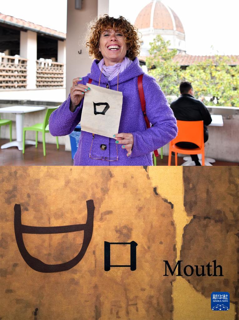 拼版照片:上圖為2023年4月13日,在意大利佛羅倫薩大學(xué)孔子學(xué)院舉辦的學(xué)寫(xiě)漢字活動(dòng)上,一名參與者展示她學(xué)習書(shū)寫(xiě)的漢字“口”(新華社記者 金馬夢(mèng)妮 攝);下圖為2023年4月19日在位于中國河南省安陽(yáng)市的中國文字博物館拍攝的“口”字甲骨文(左)(新華社記者 李安 攝)。