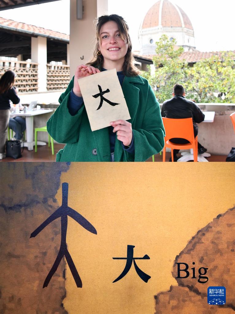 拼版照片:上圖為2023年4月13日,在意大利佛羅倫薩大學(xué)孔子學(xué)院舉辦的學(xué)寫(xiě)漢字活動(dòng)上,安娜展示她學(xué)習書(shū)寫(xiě)的漢字“大”(新華社記者 金馬夢(mèng)妮 攝);下圖為2023年4月19日在位于中國河南省安陽(yáng)市的中國文字博物館拍攝的“大”字甲骨文(左)(新華社記者 李安 攝)。