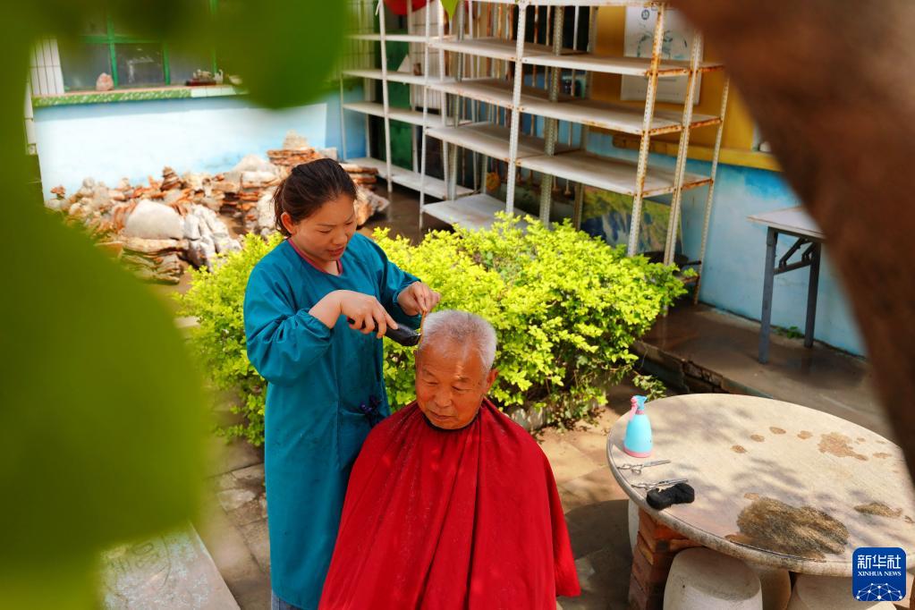 4月20日,志愿者在河北省平鄉縣后馬康村“幸福小院”內為老人理發(fā)。