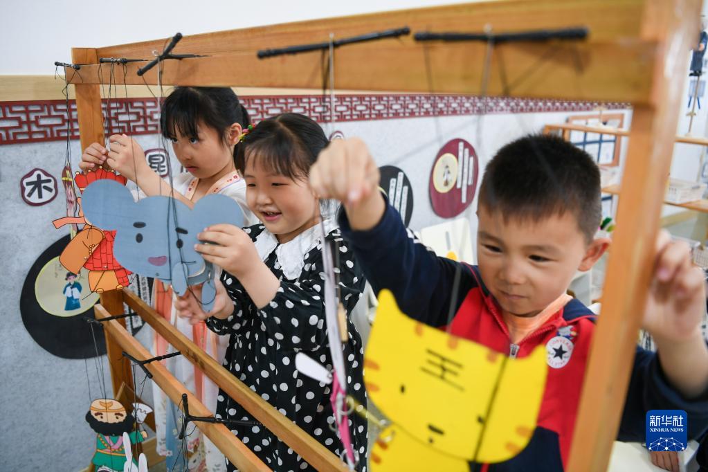 4月20日,小朋友們在玩提線(xiàn)木偶。