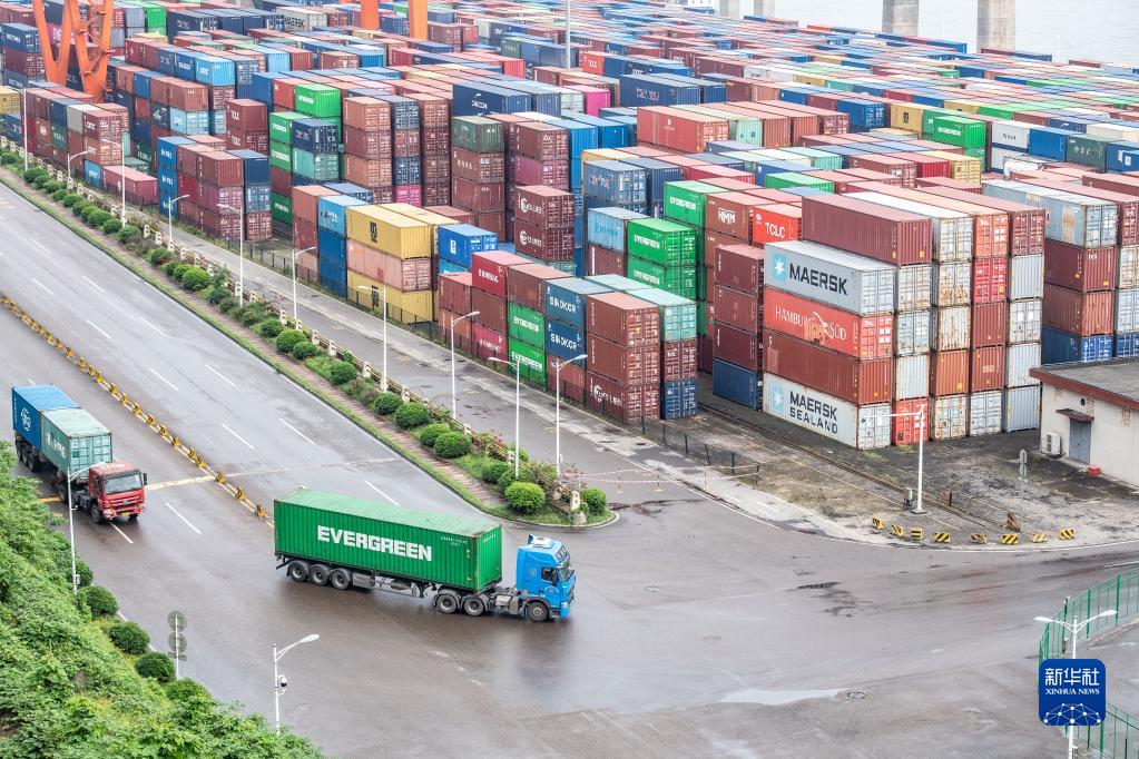 4月20日,在重慶果園港,貨車(chē)在運送集裝箱。