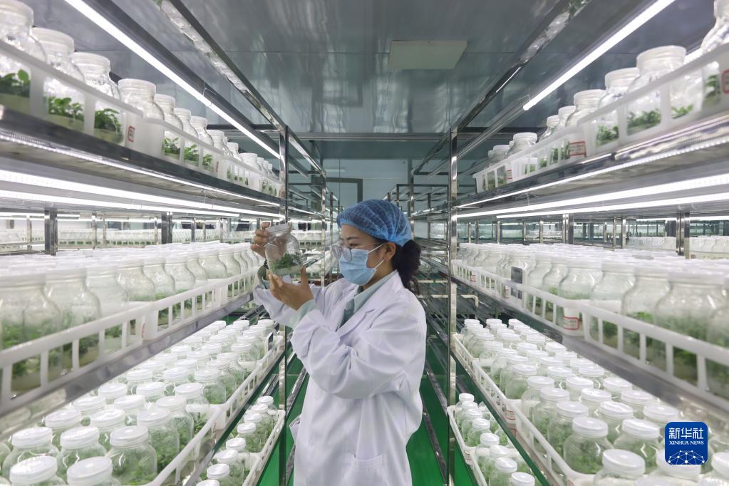 4月20日,在靜寧縣城川鎮靜寧蘋(píng)果良種苗木組培繁育中心,工作人員觀(guān)察蘋(píng)果組培苗木擴繁情況。