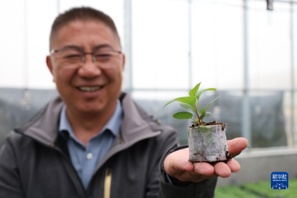 4月20日,在靜寧縣城川鎮靜寧蘋(píng)果良種苗木組培繁育中心,工作人員介紹蘋(píng)果組培苗木煉苗情況。