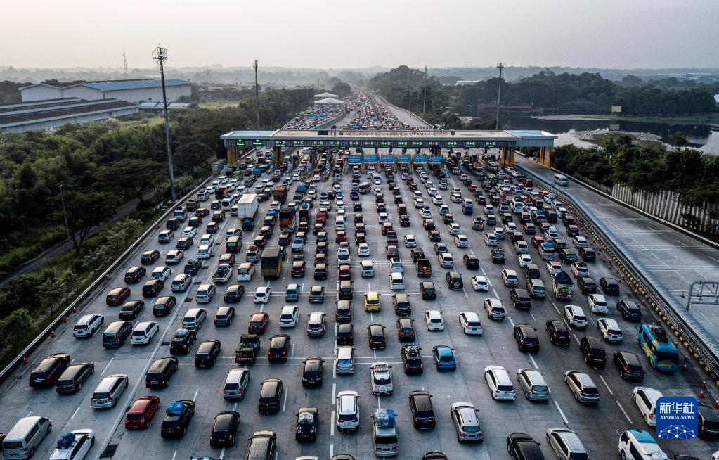 4月19日,印度尼西亞加拉璜一處道路收費站排起長(cháng)龍(無(wú)人機照片)。