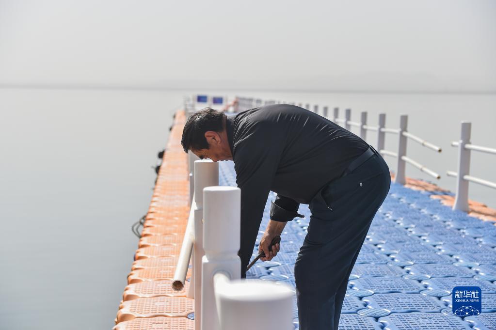 4月19日,胡登雨在對岱海的一處碼頭進(jìn)行維修。