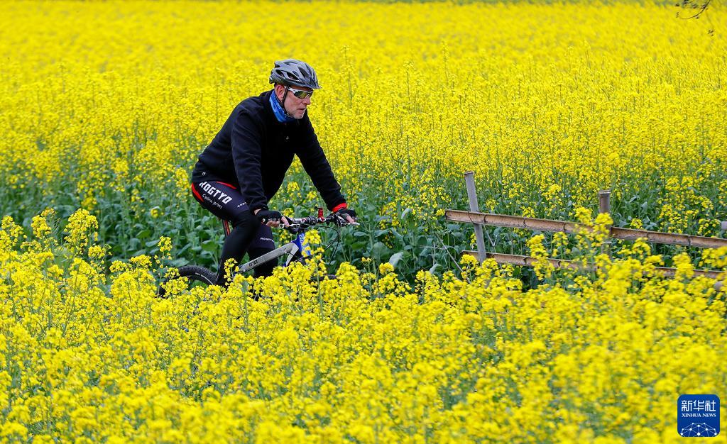 阿明在黟縣油菜花田間的道路上騎行(3月23日攝)。