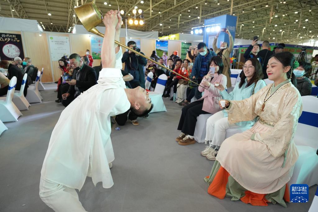 4月21日,在北京茶博會(huì )“春茶臨京城 共品非遺茶”活動(dòng)上,工作人員表演長(cháng)嘴壺技藝。