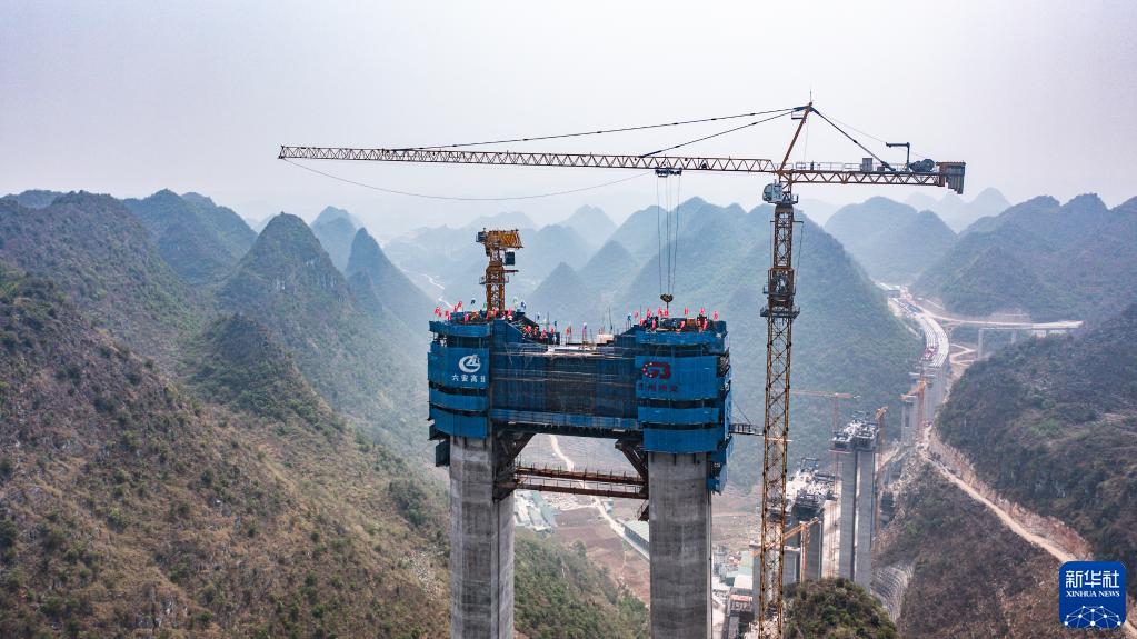 4月21日,工人在花江峽谷大橋6號主塔上進(jìn)行施工(無(wú)人機照片)。