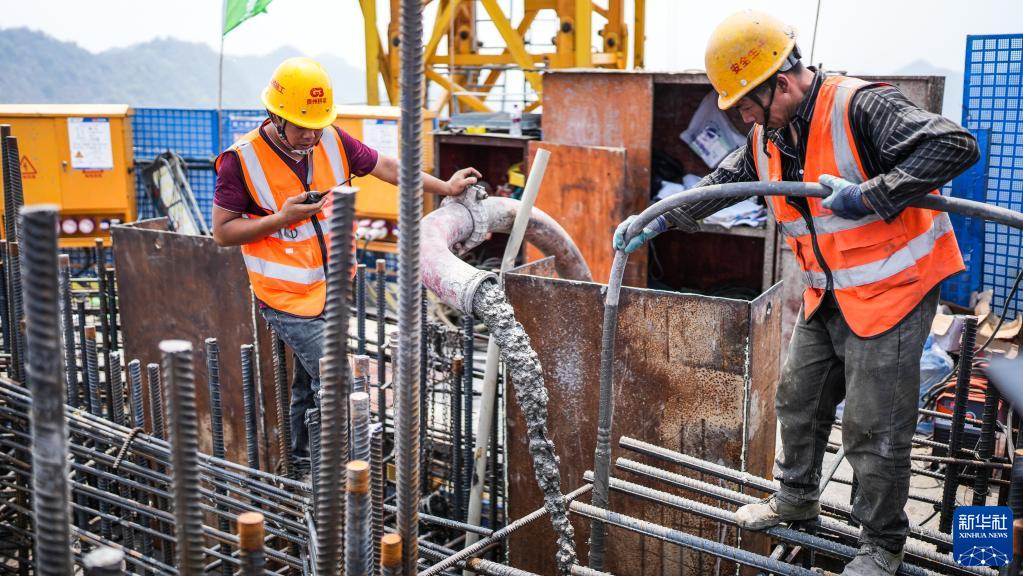 4月21日,工人在花江峽谷大橋6號主塔上進(jìn)行施工。