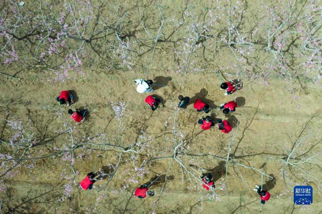 4月21日,承德縣新杖子小學(xué)學(xué)生在桃園鋤草(無(wú)人機照片)。